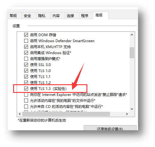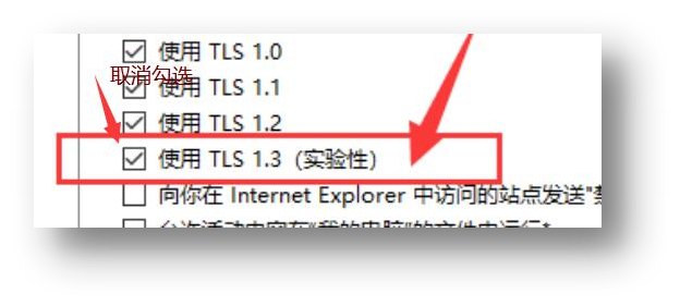 (3)找到下图中“使用TLS 1.3(实验性)”选项,取消此项勾选,则office控件可以恢复正常使用。